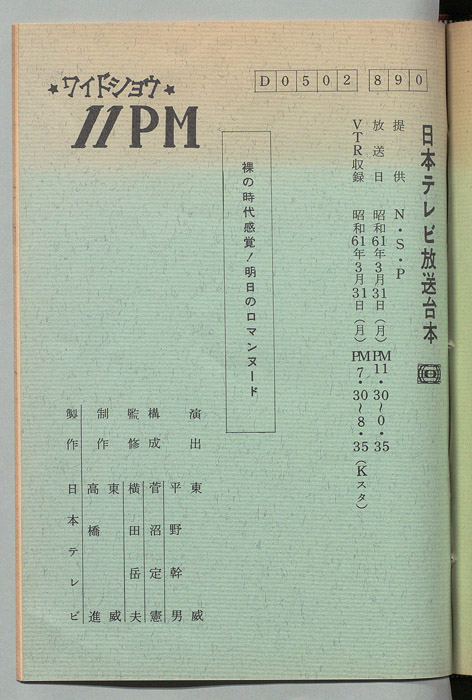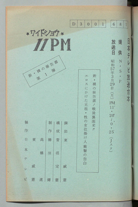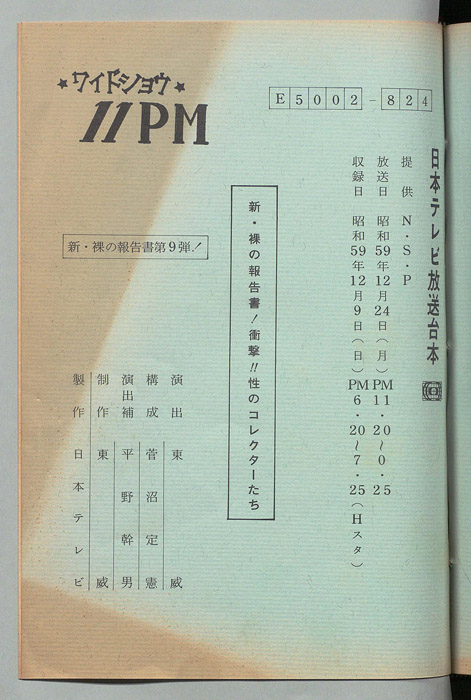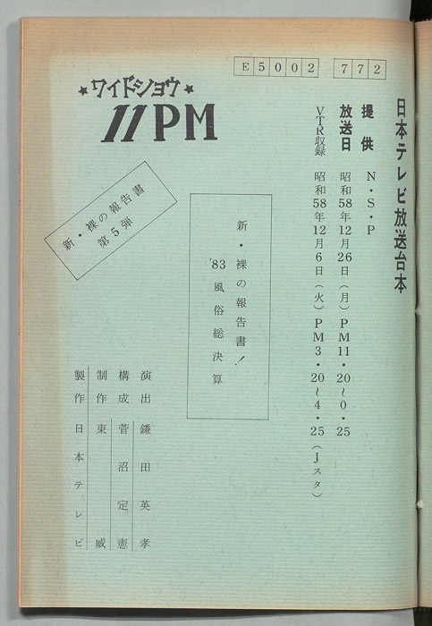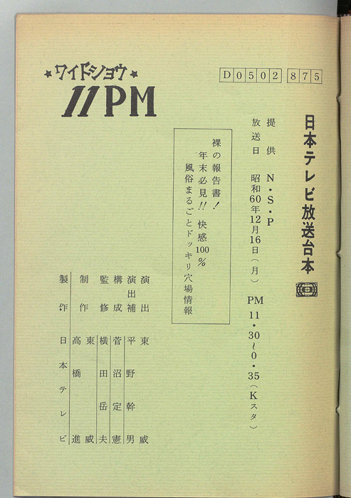 主な出演 : 大橋巨泉,松岡きっこ,いそのえいたろう,愛染恭子,荒木経惟,美加マドカ,八神康子,代々木忠,藤井智憲,筒見待子,大野皓一,丸茂ジュン,友納尚子,藤田佳の実,杉原淳とニューサラブレッズ,(ナレーター)福留功男