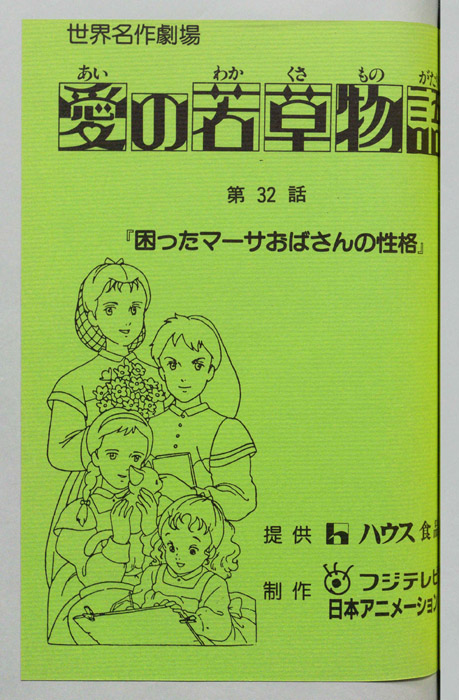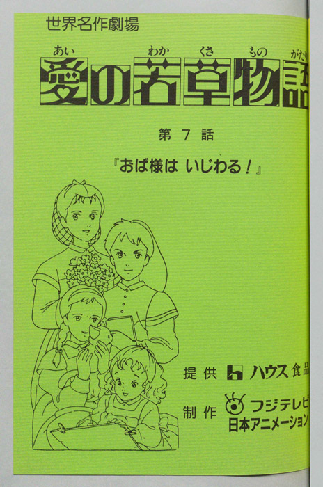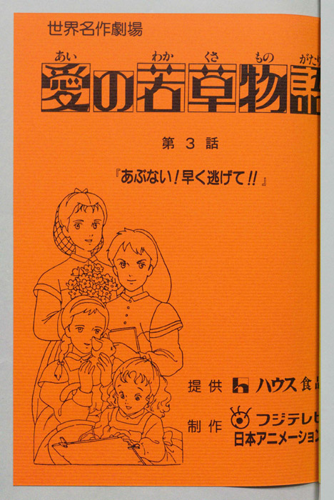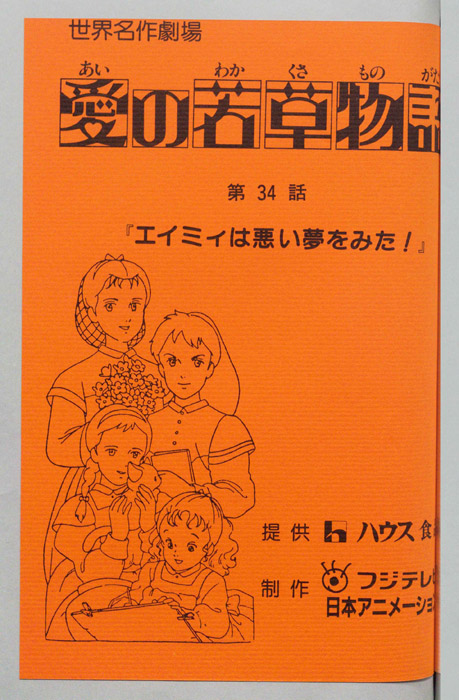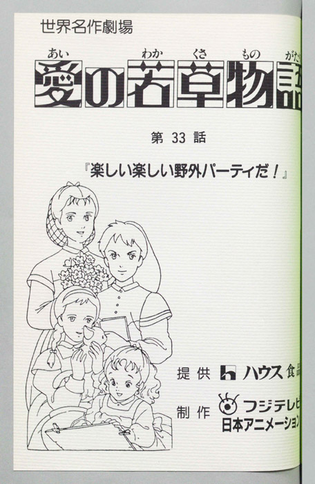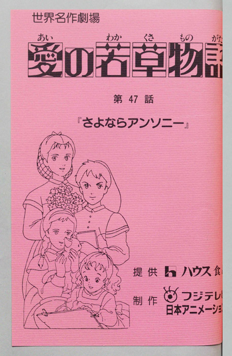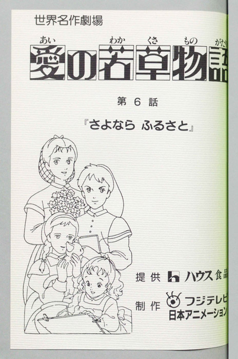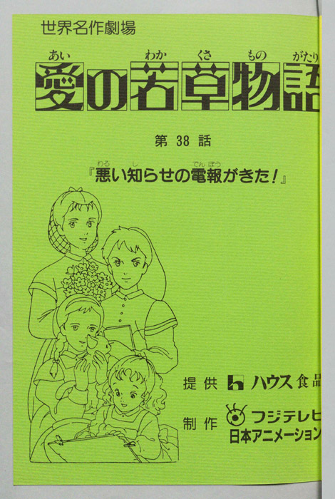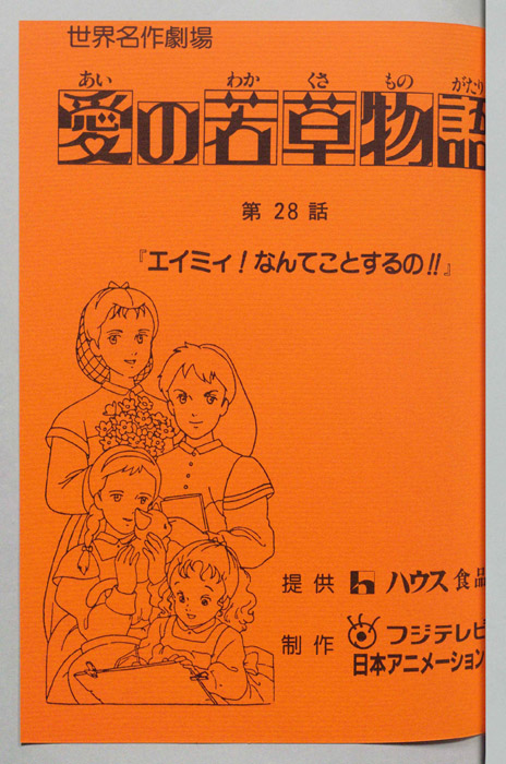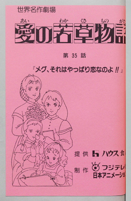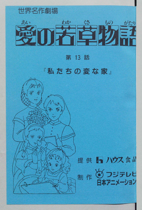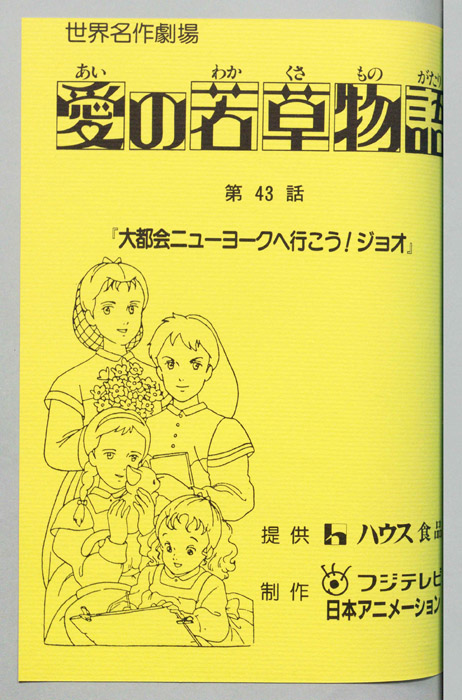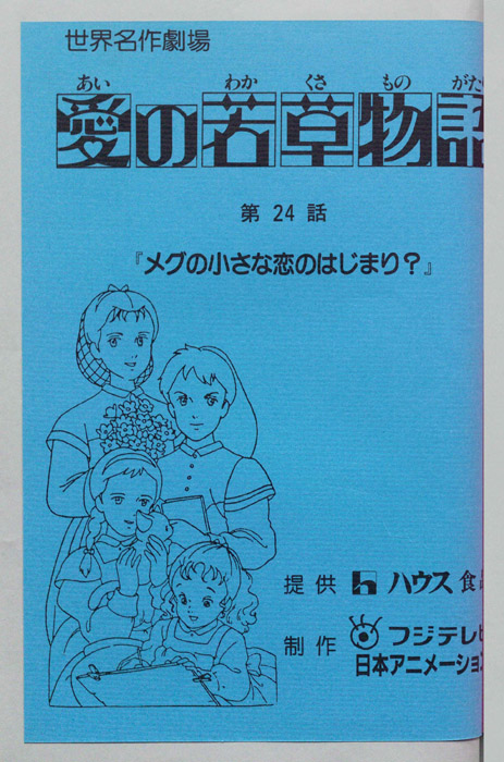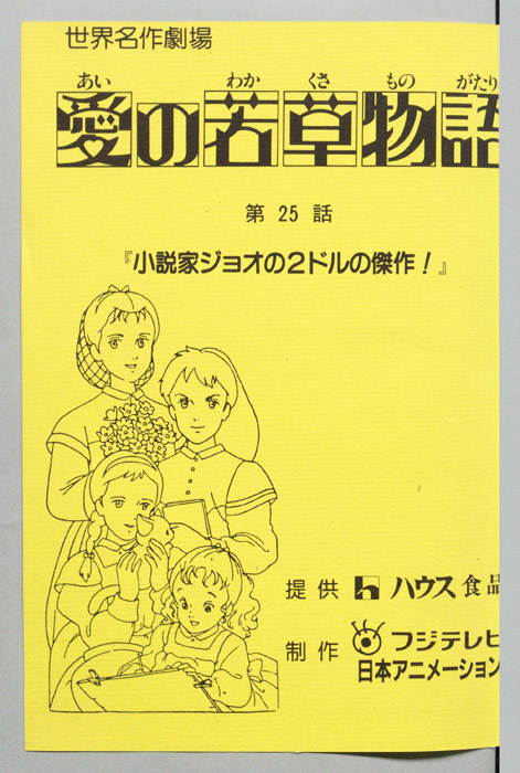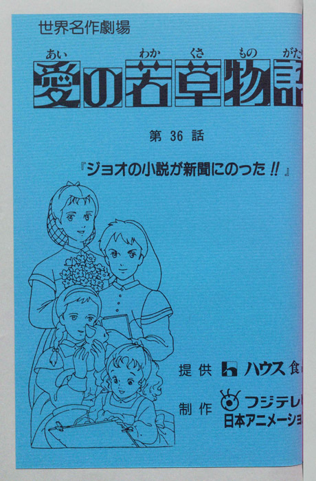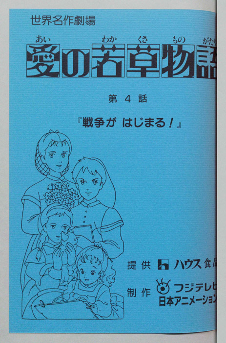 主な出演 : (メグ),(ジョオ),(ベス),(エイミー),(メアリー),(ハンナ),(ローリー),(ジェームス),アンソニー),(カール),(デーヴィス),(スージー),(ケティ)共に暮らしていた。だが戦火に一家は家を失い、父の叔母マーサを頼ってニューコードに旅立つ。一家はマーサの屋敷に居候するも、ジョオが出会った青年「アンソニー」の計らいで新たに家を借り生活を始める。やがて隣りに住む「ジェームス家」に孫「ローリー」が