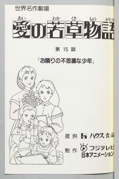 主な出演 : (メグ),(ジョオ),(ベス),(エイミー),(ローリー),アンソニー),(マーサ),(カール),(劇場の係員)共に暮らしていた。だが戦火に一家は家を失い、父の叔母マーサを頼ってニューコードに旅立つ。一家はマーサの屋敷に居候するも、ジョオが出会った青年「アンソニー」の計らいで新たに家を借り生活を始める。やがて隣りに住む「ジェームス家」に孫「ローリー」が