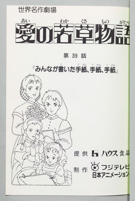 主な出演 : (メグ),(ジョオ),(ベス),(エイミー),(メアリー),(ローリー),アンソニー),(カール),(トム),(マーサ),(デーヴィッド),(サム),(スージー),(ケティ)共に暮らしていた。だが戦火に一家は家を失い、父の叔母マーサを頼ってニューコードに旅立つ。一家はマーサの屋敷に居候するも、ジョオが出会った青年「アンソニー」の計らいで新たに家を借り生活を始める。やがて隣りに住む「ジェームス家」に孫「ローリー」が