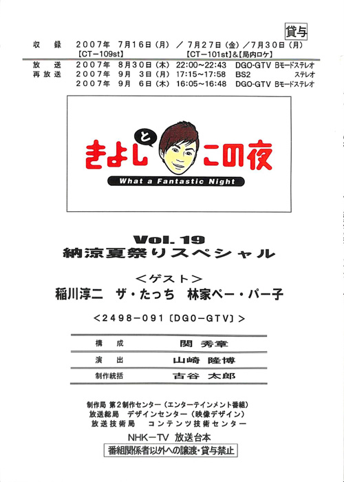主な出演 : 清水アキラ,松村邦洋,海砂利水魚,ジェニーいとう,千田光雄,山田健二,末吉,カール北川,わたる哲平,榊原郁恵,三井ゆり,星奈々,藤川なお美,伊藤なつ・かな,山本ヘンダ,春菜愛,井上順,定岡正二,針すなお,ビジー・フォー/グッチ裕三,モ