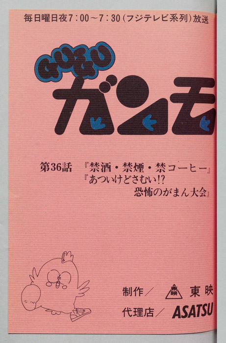 主な出演 : [ガンモ:杉山佳寿子,佃半平太:田中真弓,西郷敏満:塩沢兼人,藤田カシオ:水島裕,リンダ・スカイラーク:三田ゆう子,市谷あゆみ:高橋美紀,佃つくね:大塚智子,ママ:吉田理保子,パパ・デジャブ―:千葉繫,ばあや:八奈見乗児]【Gu-Gu ガンモ】「かわいがってやってください」という立て札の下に置かれていた巨大なタマゴから生まれた言葉を話すピンクの太った鳥『ガンモ』は、自分を拾ってくれた佃家のお世話になることになる。勉