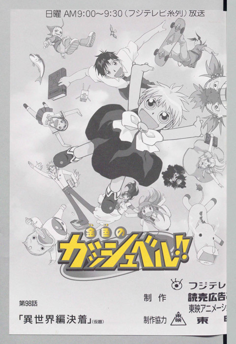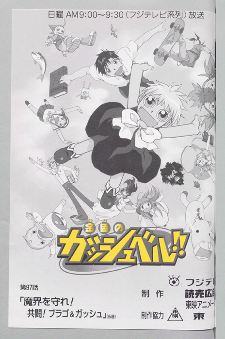 主な出演 : (ガッシュ・ベル)大谷育江,(高嶺清麿)桜井孝宏,(水野すずめ)秋谷智子,シェリー)折笠富美子,(ブラゴ)小嶋一成,(ゴフレ)小野大輔,(連次)御園行洋,(マリ子)埴岡由紀子,(細川)山口健,(ナオミ)溝脇しほみ,(子供たち)【金色のガッシュベル】 千年に一度行われる『魔界の王』を決める戦いに選ばれた百人の魔物の子供達、彼らは自身の内に秘めた力を引き出せる同じ心の形を持った人間のパートナーを探して、人間界で『魔本』の