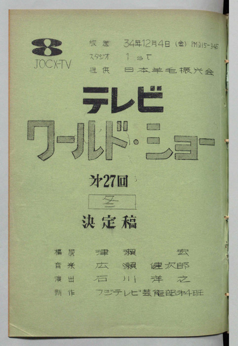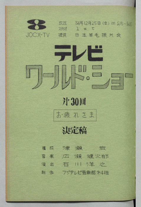 主な出演 : 五十嵐喜芳,トニー谷,宇治かほる,沢たまき,藤村有弘,伊藤素道とリリオ・リズム・エアーズ,(スタジオNo.1ダンサーズ)浦辺日佐男,小井戸秀宅,斉藤健,市川義礼,中北万里子,名倉加代子,今喜世,米倉栄子,橋本佐智子