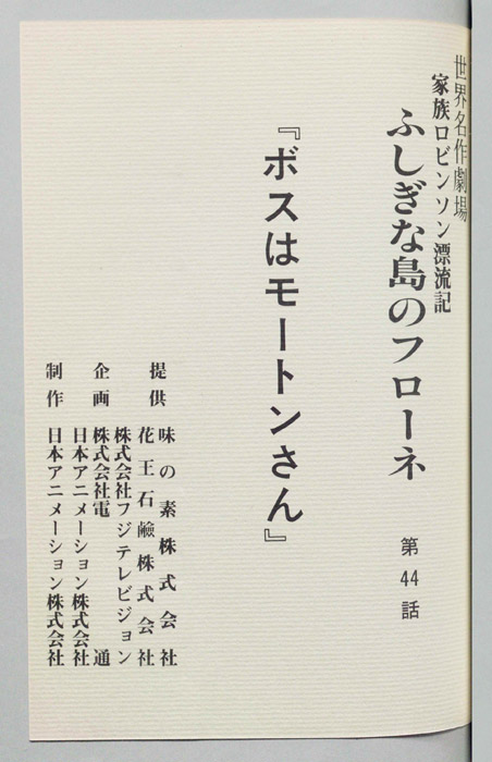 主な出演 : (フローネ)松尾佳子,(フランツ)古谷徹,(ジャック)高坂真琴,(エルンスト:父)小林勝彦,(アンナ:母)平井道子,(ダムダム)塩屋翼,(モートン)永井一郎【家族ロビンソン漂流記 ふしぎな島のフローネ】1813年、開業医を営む「エルンスト・ロビンソン」は妻「アンナ」、そしてその子供たちである長男「フランツ」、長女「フローネ」、次男「ジャック」の5人