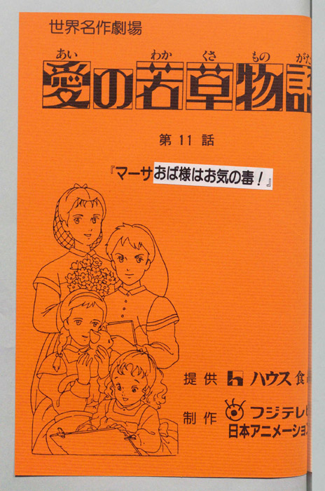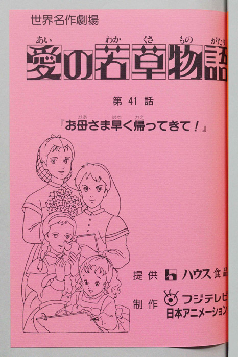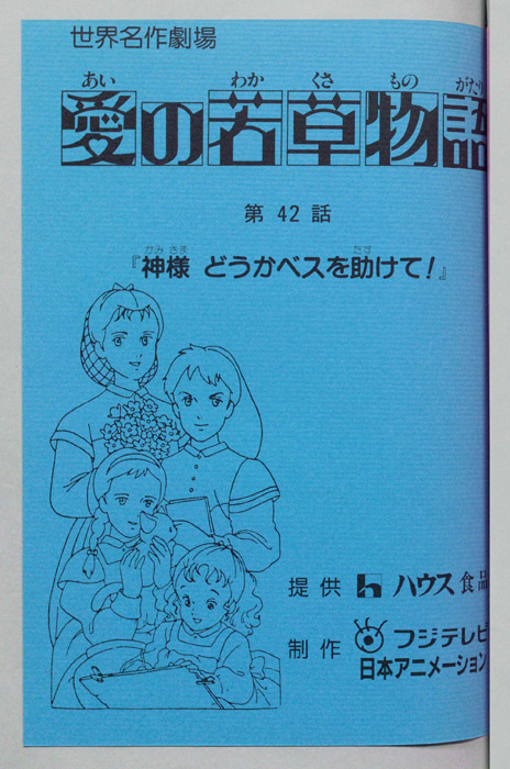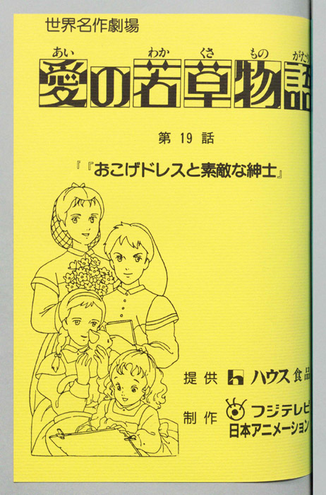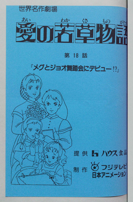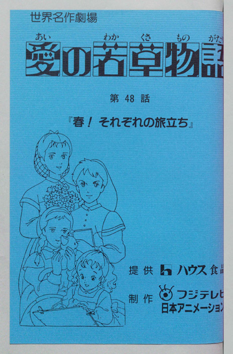 主な出演 : (メグ),(ジョオ),(ベス),(エイミー),(メアリー),(フレデリック),(ローリー),(ジェームス),マーサ),(カール),(デーヴィッド),(ヘンリー),(ジョン),(ハンナ)共に暮らしていた。だが戦火に一家は家を失い、父の叔母マーサを頼ってニューコードに旅立つ。一家はマーサの屋敷に居候するも、ジョオが出会った青年「アンソニー」の計らいで新たに家を借り生活を始める。やがて隣りに住む「ジェームス家」に孫「ローリー」が