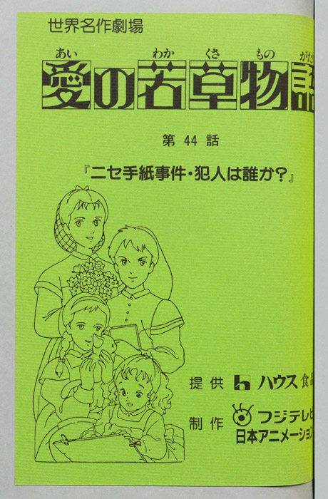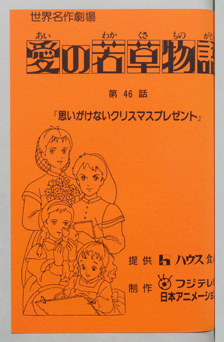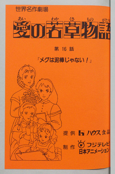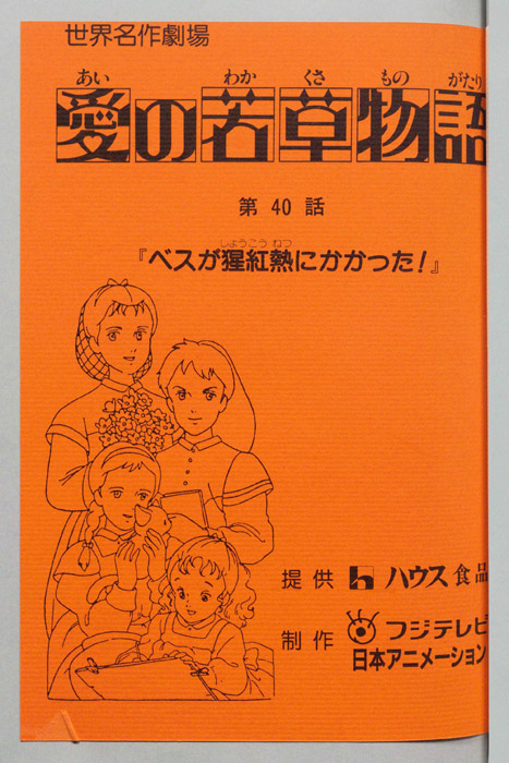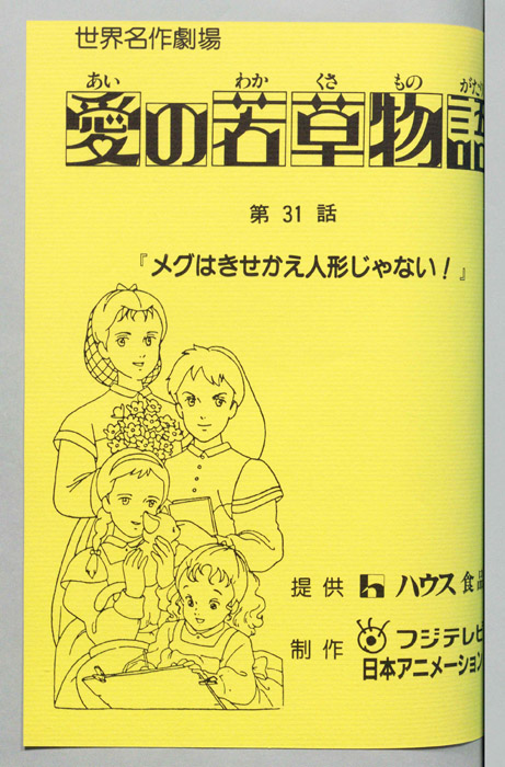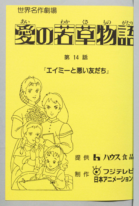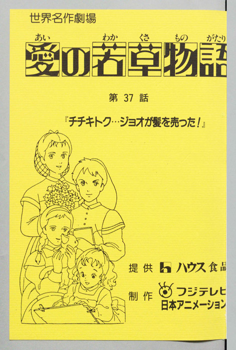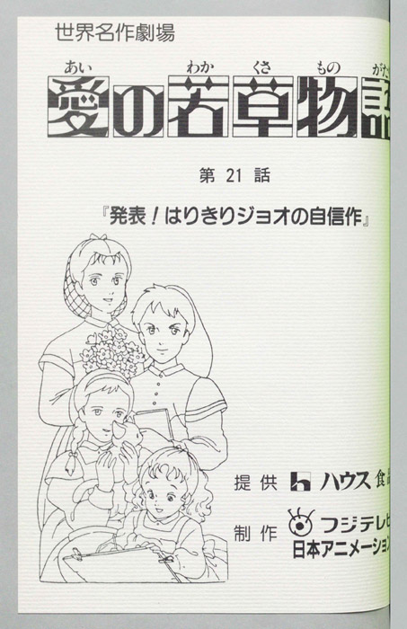 主な出演 : (メグ),(ジョオ),(ベス),(エイミー),(メアリー),(ローリー),(カール),(アンソニー),(ヘンリー),(ジュン),マーサ),(エスター)共に暮らしていた。だが戦火に一家は家を失い、父の叔母マーサを頼ってニューコードに旅立つ。一家はマーサの屋敷に居候するも、ジョオが出会った青年「アンソニー」の計らいで新たに家を借り生活を始める。やがて隣りに住む「ジェームス家」に孫「ローリー」が