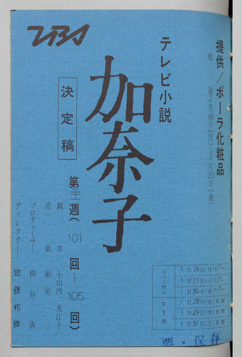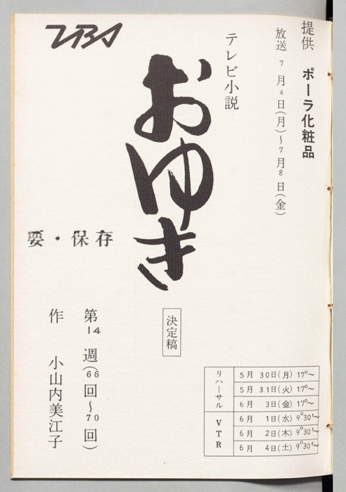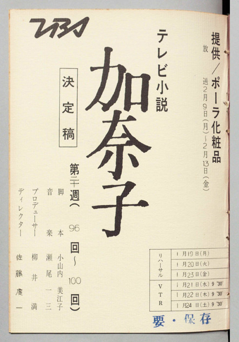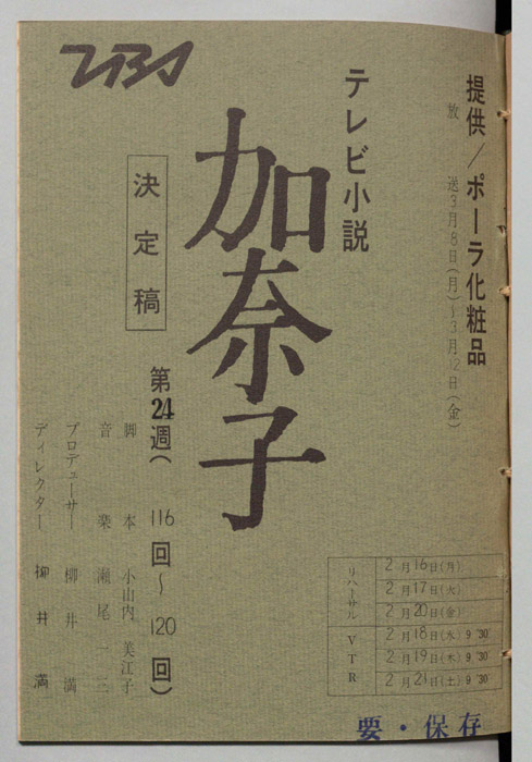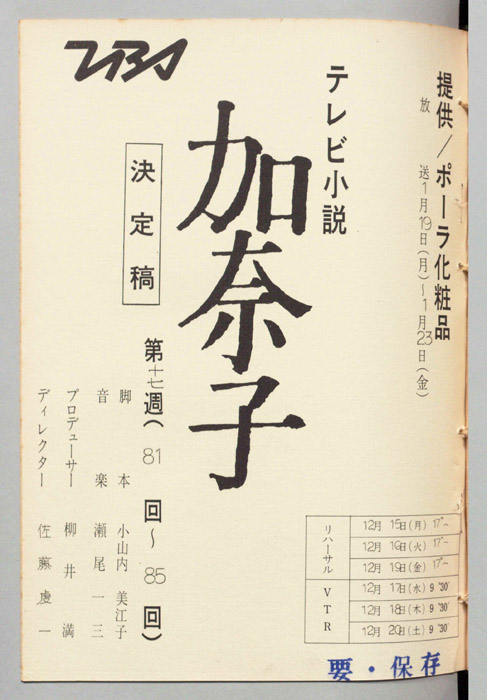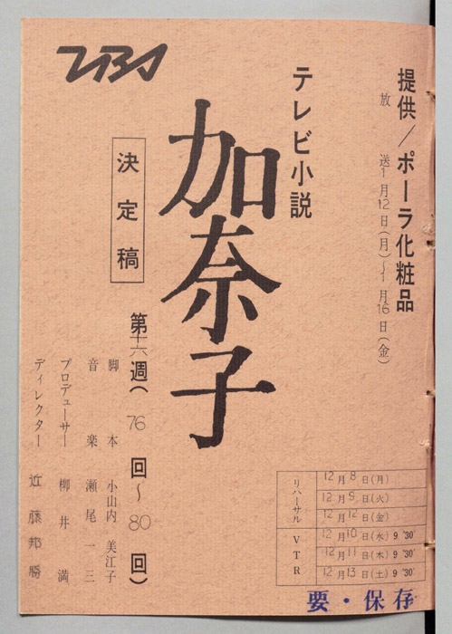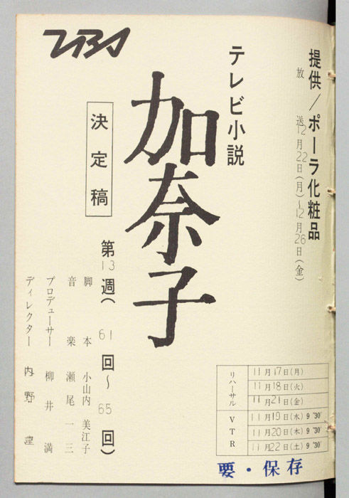主な出演 : 渡辺美佐子,曾我廼家明蝶,大森暁美,旗和子,和沢昌治,三木弘子,藤田啓二,宮田桂,本郷淳,和田周,義那道夫,成田光子- 作家 : 小山内美江子