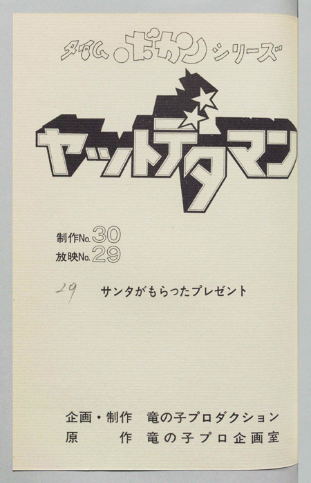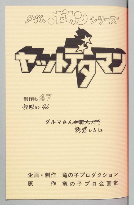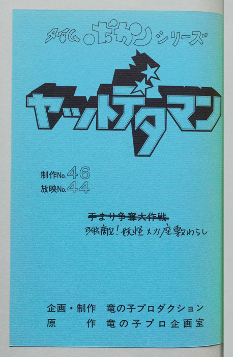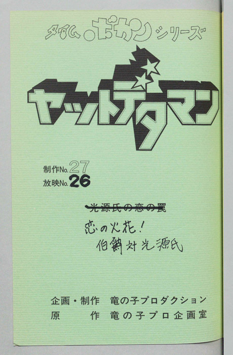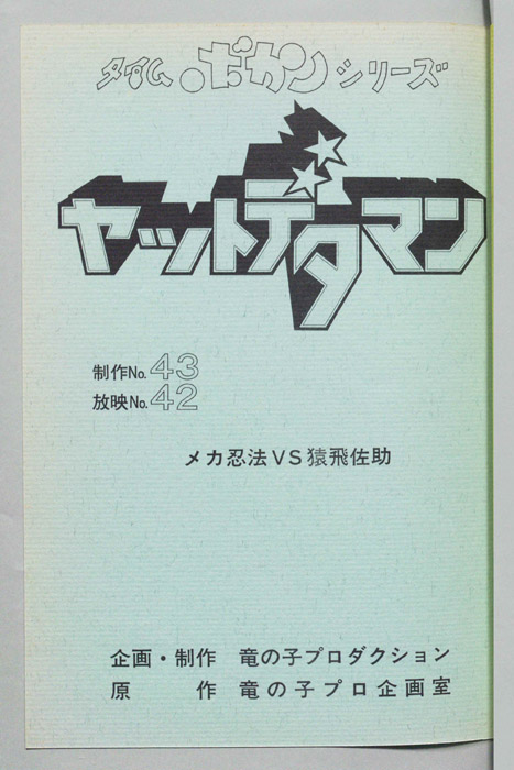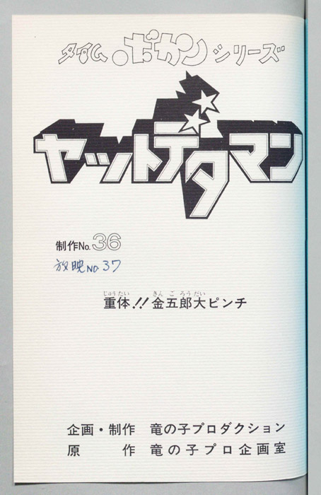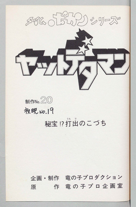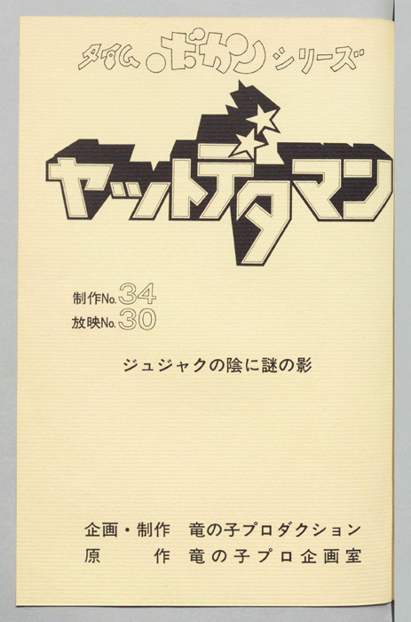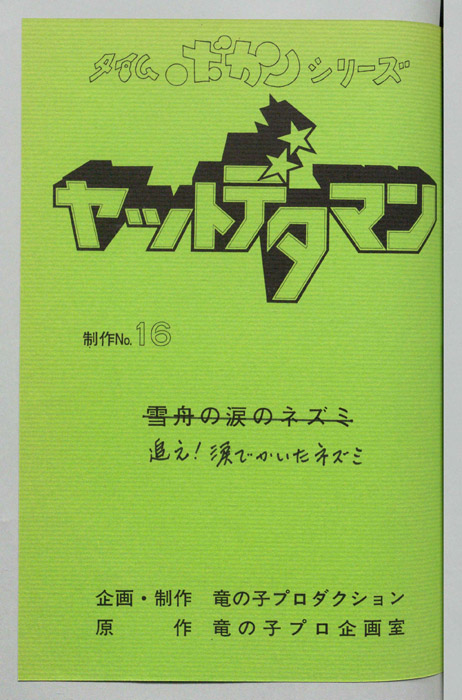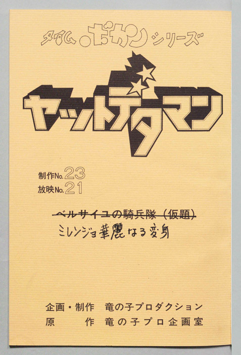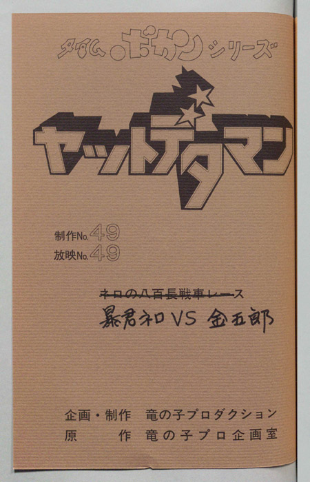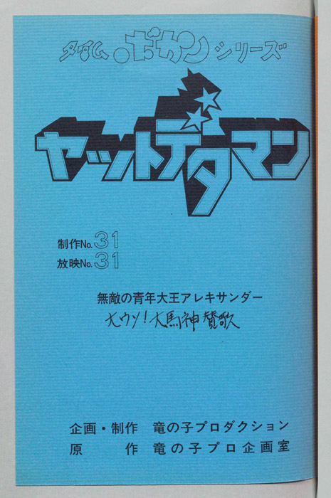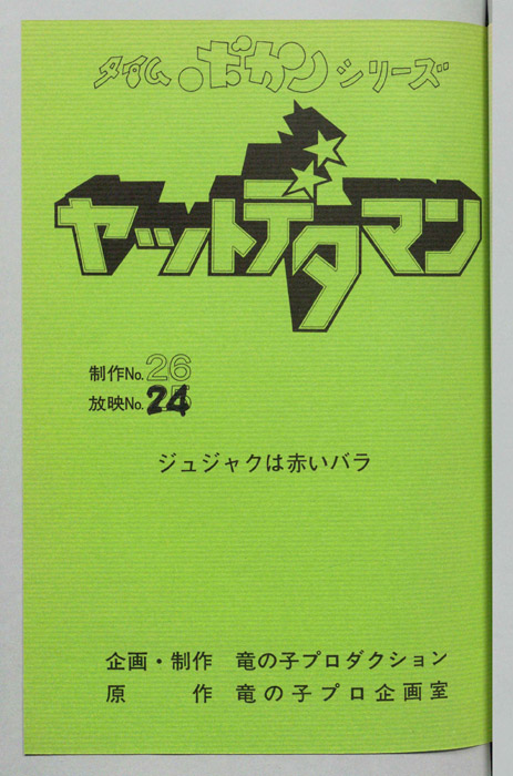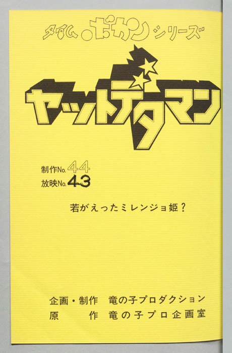 主な出演 : (ワタル)曽我部和行,(コヨミ)三浦雅子,(カレン姫)土井美加,(ダイゴロン)屋良有作,(遠山金五郎)阪脩,(ミレンジョ姫)小原乃梨子,(コケマツ)八奈見乗児,(スカドン)たてかべ和也,(コマロ)丸山裕子,(ドンファンファン)山【ヤットデタマン】 私立探偵事務所で助手として働くワタルとコヨミの元に1000年の未来から二人の遠い子孫である『カレン姫』がタイムマシンでやってくる。タイムトラベルの目的は時空を飛び越えることができる伝説の『ジュジャク』と