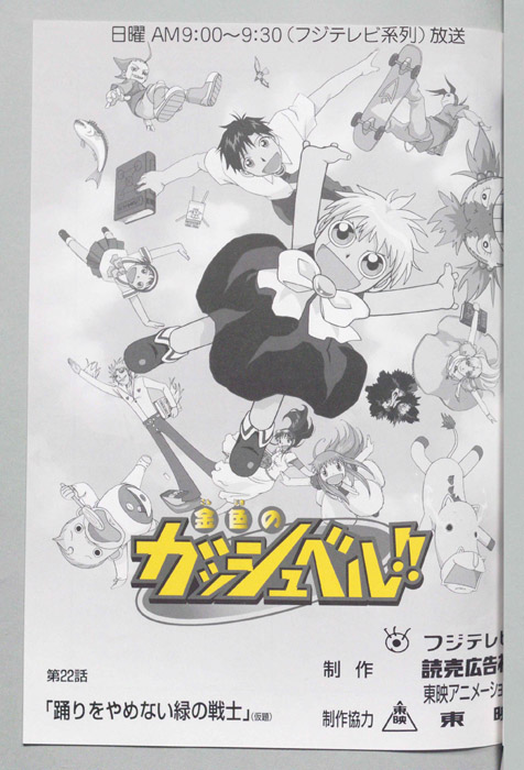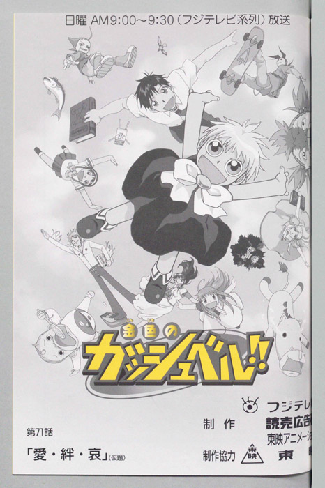 主な出演 : (ガッシュ・ベル)大谷育江,(高嶺清麿)桜井孝宏,(水野鈴芽)秋谷智子,(高嶺華)山﨑和佳奈,(高嶺清太郎)置鮎龍太郎,(金山)高木渉,(数学教師)上別府仁資,(生徒達),(窪塚泳太)神谷浩史,(ハイド)浦和めぐみ,(シェリー)折【金色のガッシュベル】 千年に一度行われる『魔界の王』を決める戦いに選ばれた百人の魔物の子供達、彼らは自身の内に秘めた力を引き出せる同じ心の形を持った人間のパートナーを探して、人間界で『魔本』の