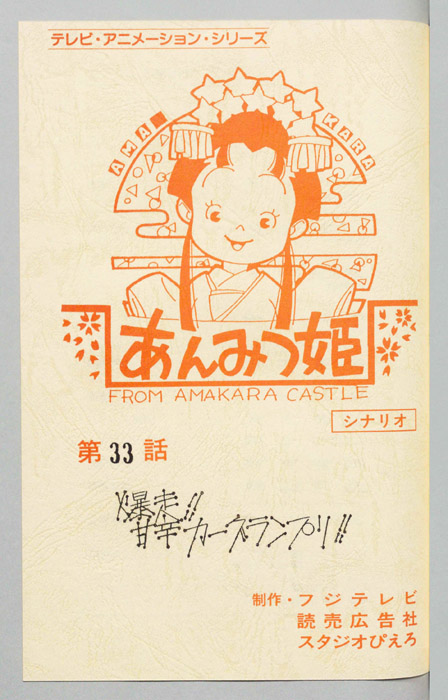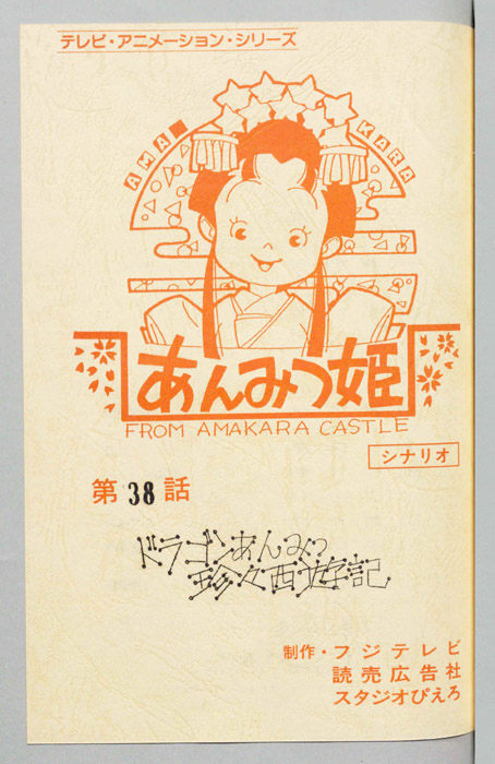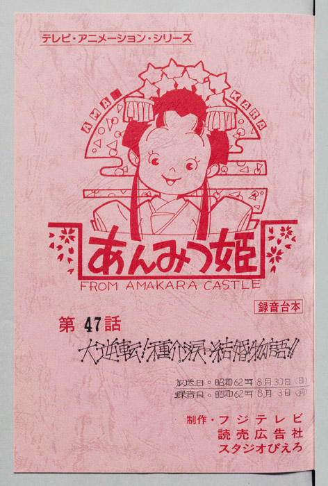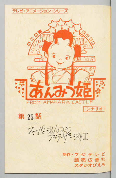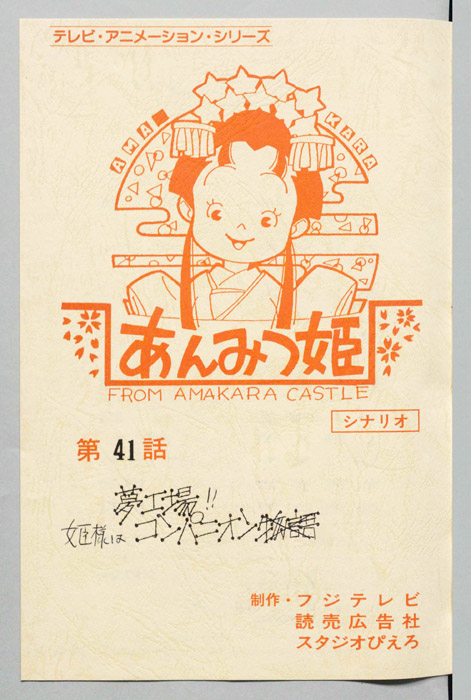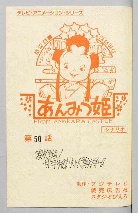 主な出演 : (あんみつ姫)小山茉美,(団子の守)神山卓三,(しぶ茶)京田尚子,(家老)八奈見乗児,(柿の種介)千葉繁,(だんご)吉田美保,(もなか)今井洋子,(きなこ)西原久美子,(かのこ)前田雅恵,(あんこ)江沢昌子,(語り)大野智子,[(吾助)北【あんみつ姫】あまから城のお姫様「あんみつ姫」は、器量がよく優しい性格をしているが、やんちゃでおてんばなところがあり、その好奇心から城の中だけでなく、城下町でも自由奔放な行動をしては周囲の人々を困らせていた。ア