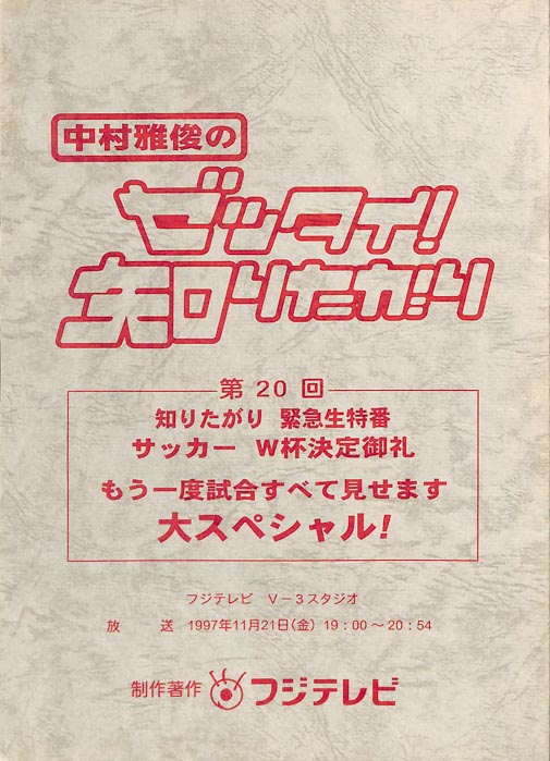 主な出演 : 福井謙二,八木亜希子,岡野雅行,川淵三郎,北澤豪,清水秀彦,都並敏史,岡本夏生,山田まりや,長坂哲夫,西山喜久恵,田中秀幸,石川英郎,増谷康紀,中友子