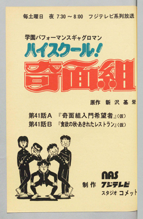 主な出演 : (一堂零)千葉繫,(冷越豪)玄田哲章,(出瀬潔)二又一成,(大間仁)龍田直樹,(物星大)塩沢兼人,(河川唯)高橋美紀,(宇留千絵)松井菜桜子,(真実一郎)島田敏,(二階胴面一)竹村拓,(骨岸無駄郎)亀山助清,(骨岸無造)亀山助清/(一『ハイスクール!奇面組』平凡な学校生活を送っていた女子中学生『河川唯(かわ ゆい)』と『宇留千絵(うる ちえ)』は、『奇面組』と呼ばれる悪名高い5人の男子学生と出会うことによって、退屈だった学生生活が一変する。奇面組のリーダー『一堂零(い