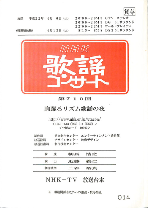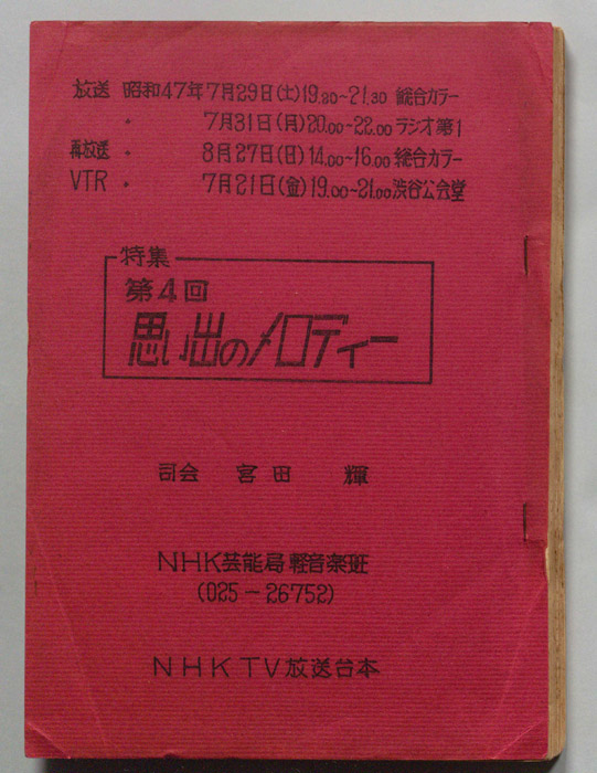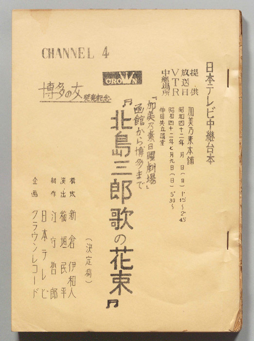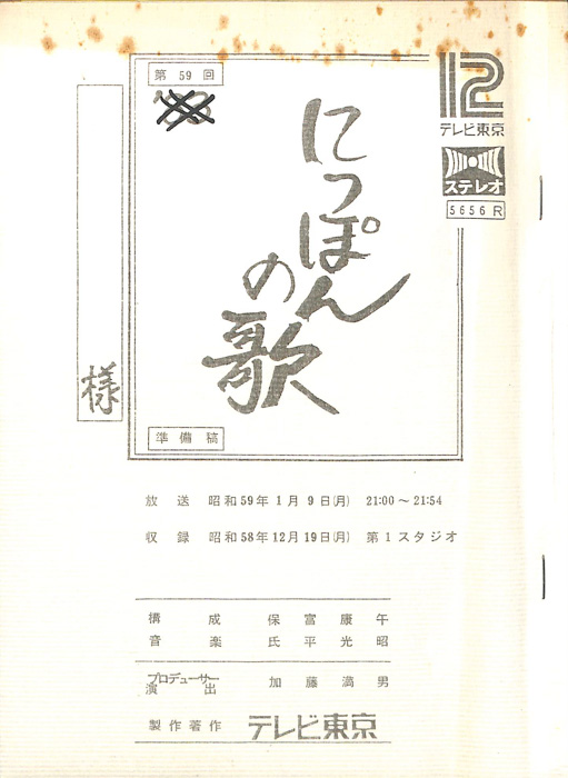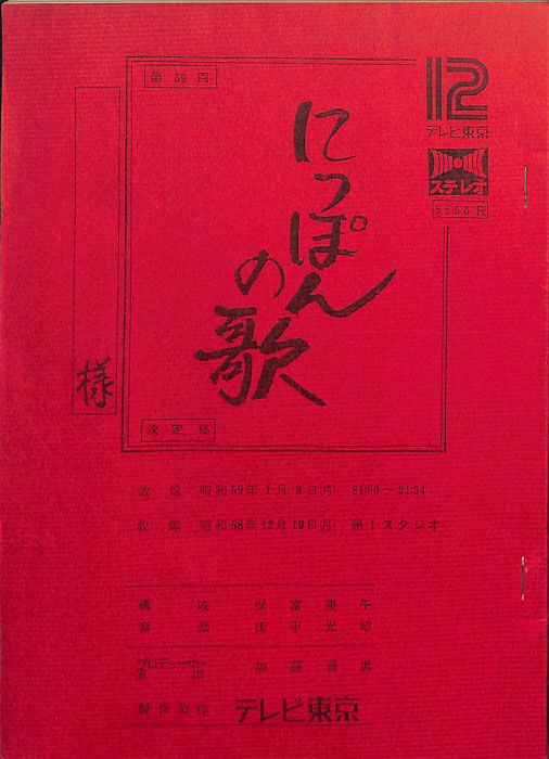 主な出演 : 五木ひろし,キム・ヨンジャ,小金沢昇司,小村美貴,五月みどり,天童よしみ,橋幸夫,三山ひろし,もんたよしのり,和田青児,小田切千- 作家 : 小山内美江子