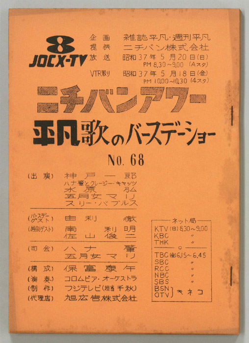主な出演 : 藤勉,榎本晴夫,林沖,ジェーン岡田,長沢純,手塚しげる,早瀬雅男,内田裕也,ほりまさゆき,沢りり子,波多まゆみ,泉かおり,望月浩,藤本好一,奥村チヨ,槇みちる,山田寛一,杉本尉二,ミスター珍,なべおさみ,五月女まり,千原しのぶ,市川好郎,宮- 作家 : 櫻井康裕