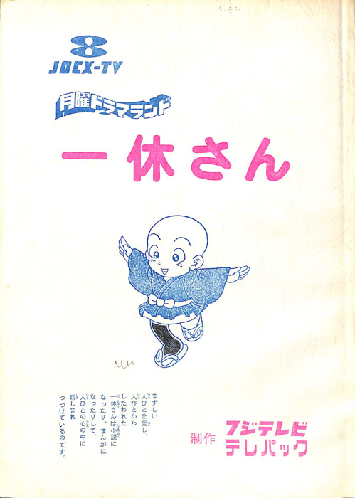 【一休さん】舞台は室町時代。足利義満将軍が南北朝の争いを平定するも、いまだ不穏な時代が続いていた。千菊丸(せんぎくまる)は天皇の息子として誕生したが、母方の祖父が足利家と対立したため、将軍の命令を受けて安国寺の小僧となり「一休」を