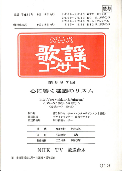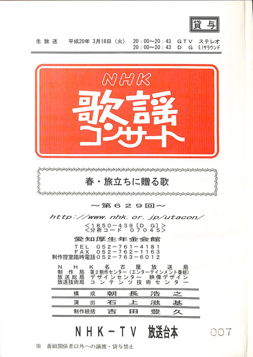 主な出演 : 北島三郎,香西かおり,山川豊,桂銀淑,KAN,坂本冬美,神野美伽,藤あや子,伍代夏子,冠二郎,北見恭子,金蓮子,小金沢昇司,島津亜矢,滝里美,徳巻駒子,中村美津子,野中彩央里,祭小春,若山かずさ,亜沙美,太田幸希,唐木淳,胡桃沢ひろ子,高