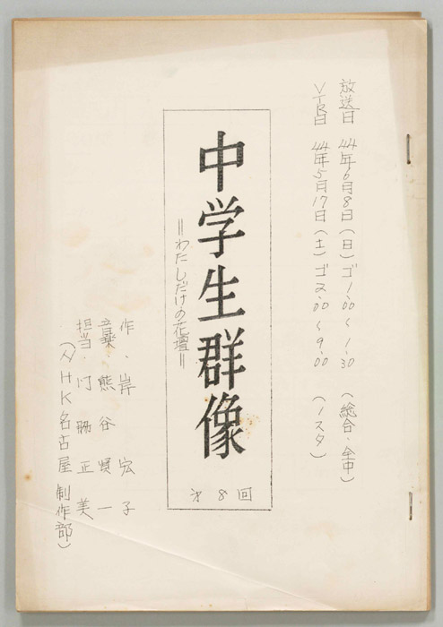 主な出演 : 新間正次,内田藍子,長沢大,渡辺康子,磯輪吉宏,鈴木敦宏,横井規和,小田正雄,玉置丈晴,早川元貴,松本弘樹,丹下真治,田内伸幸,加藤光,岩田洋子,川田真愉,小林香織,鬼頭晴奈,春日真琴,加賀谷友香,臼井真紀,岩崎理奈,谷中見子,岡【中学生日記】 中学生日記は1972年から2012年3月まで長きに渡って放送された学園ドラマである。1962年4月から放送された「中学生次郎」という番組を前身とし、何度か番組名を変更しつつ本ドラマに至る。最