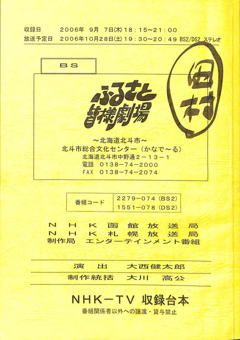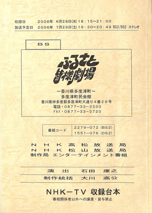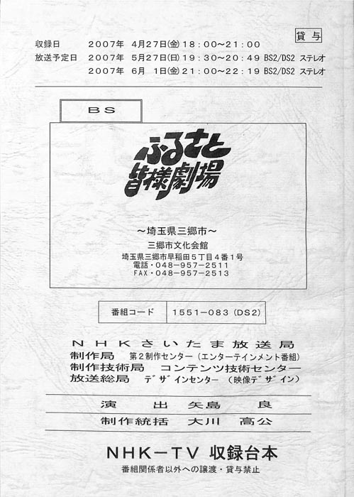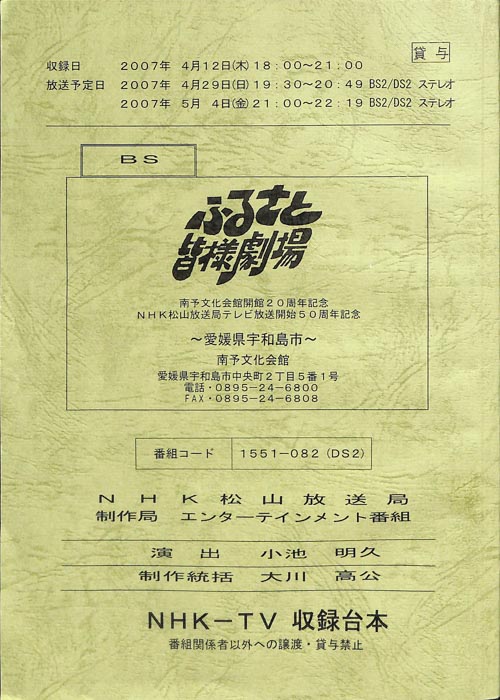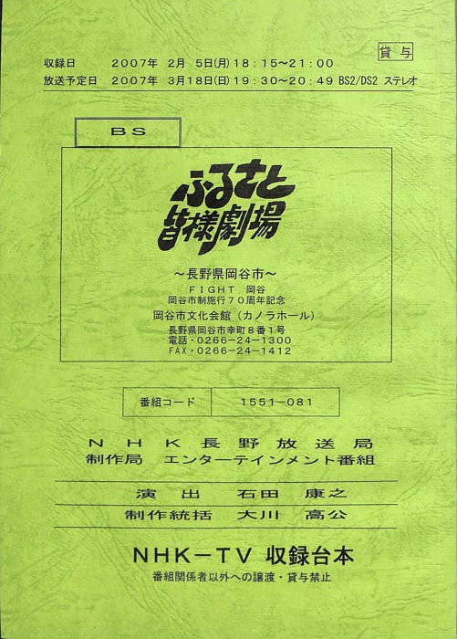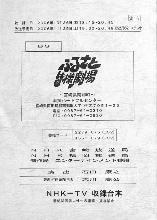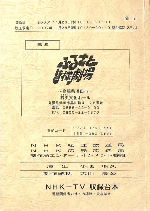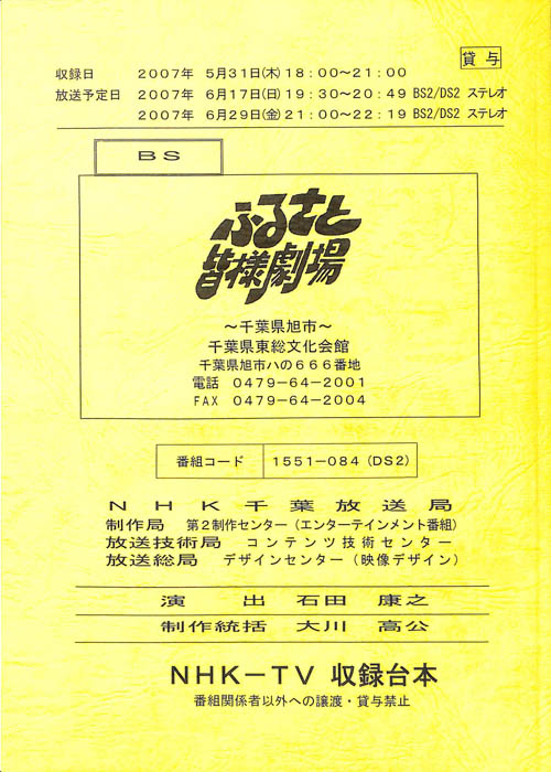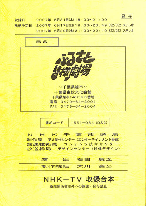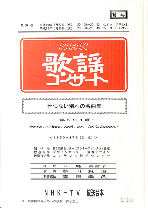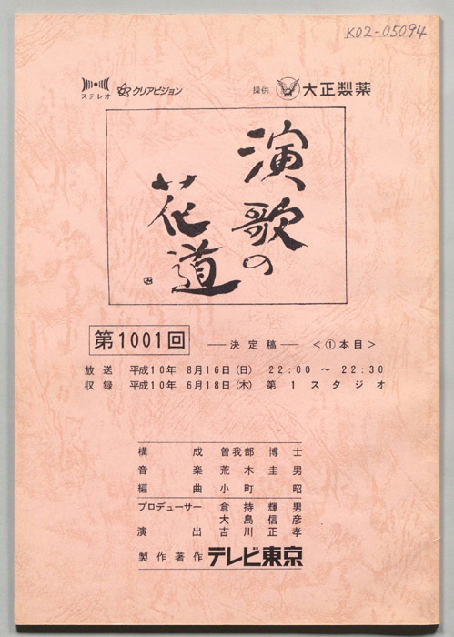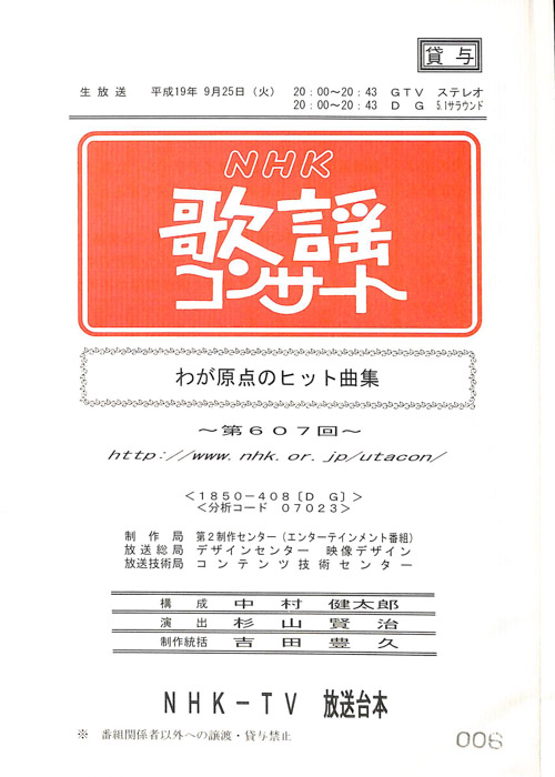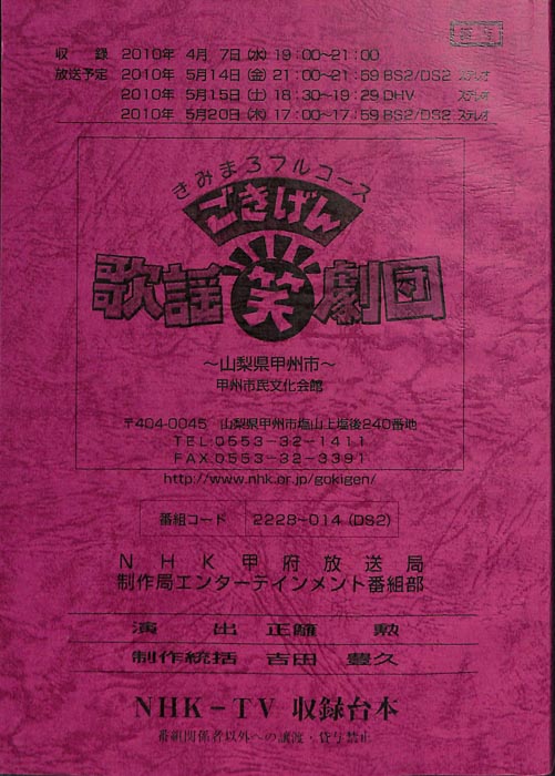 主な出演 : 秋川雅史,岩崎宏美,小林旭,小村美貴,姿憲子,千葉一夫,中村美律子,前川清,松原健之,松原のぶえ,小田切千