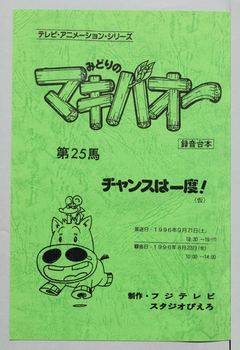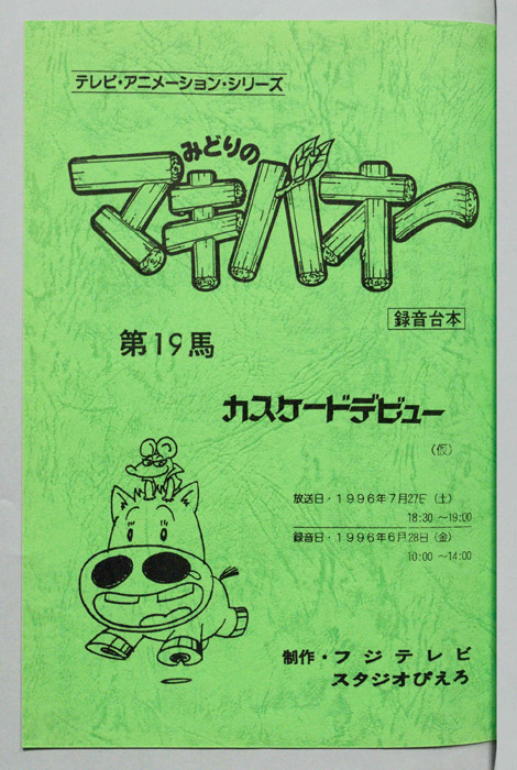 主な出演 : 蔦)藤本譲,(カスケード)玄田哲章,(本多平七郎)加賀谷純一,(本多麗)白鳥由里,(服部政人:半蔵)大滝進矢,(ニトロニクス)石井康嗣,(ツァビデル)大塚明夫,(ドルジ)茶風林,(アナウンサー),(フランス人アナ)茶風林【みどりのマキバオー】北海道の牧場『みどり牧場』の名馬「ミドリコ」から、まるでロバのような不思議な姿の馬「マキバオー」が生まれる。その後、みどり牧場の借金を返済する為、ミドリコが堀江牧場へ売られることになり、母