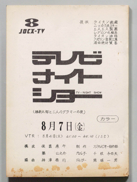 主な出演 : 水原弘,ミッキー・カーチス,平尾昌晃,山下敬二郎,尾藤イサオ,鶴岡雅義と東京ロマンチカ,にしきのあきら,野村真樹,君夕子,ヒデとロザンナ,畠山みどり,勝新太郎,浜口庫之助,川内康範,(司会)ケーシー高峰,高崎一郎,(楽団)ダ- 作家 : 舟橋和郎