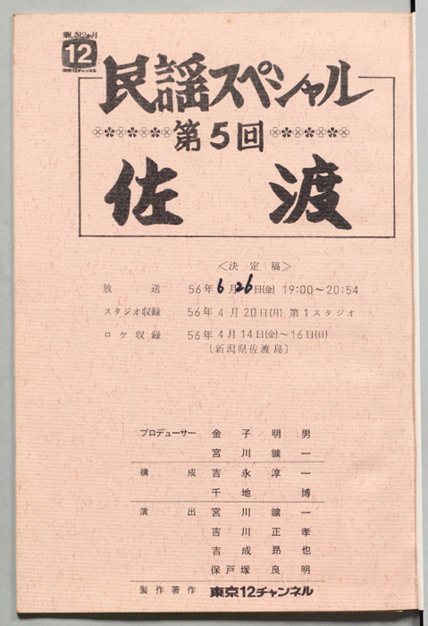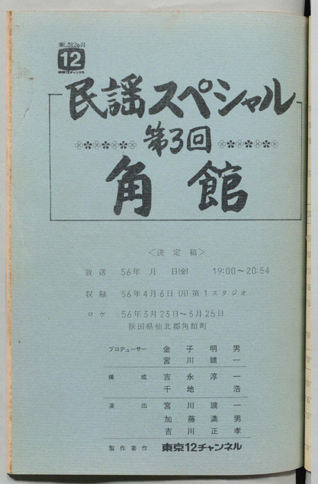 主な出演 : 江村貞一,小沢千月,金沢明子,小杉真貴子,高橋キヨ子,藤みち子,(司会)玉置宏,(踊り)民族芸能文化連盟,(津軽三味線)沢田勝秋,(太鼓)美波那る駒,(伴奏)藤本琇丈社中<三味線>藤本秀輔,藤本秀三,藤本秀康,藤本直秀,<鳴物>山