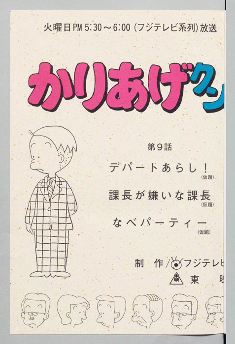 主な出演 : (かりあげ)[塩屋翼],(社長)[八奈見乗児],(課長)[野田圭一],(古川)[難波圭一],(佐藤)[堀川亮],(ヒサエ)[渡辺菜生子],(カヨコ)[川浪葉子],(課長の奥さん)[三田ゆう子],(もみあげ)[山田恭子],(おかっぱ)[萩『かりあげクン』「ほんにゃら産業」の営業課に勤務し、刈り上げ頭が特徴的なサラリーマン「かりあげ正太」は、上司に媚びることを嫌い、人と同じ行動を取ることを好としない変わり者だった。しかし、イタズラをすることには天才的な能力を発揮する。正