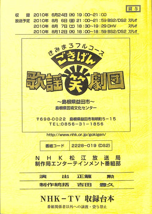 主な出演 : 綾小路きみまろ,大川良太郎,さかなクン,冠二郎,島倉千代子,松居直美,松村邦洋,山本みゆき,村岡弘之,宮川康裕,玄也,井上理恵,戸田比呂子,ツーライス,樋浦舞花,樋浦結花
