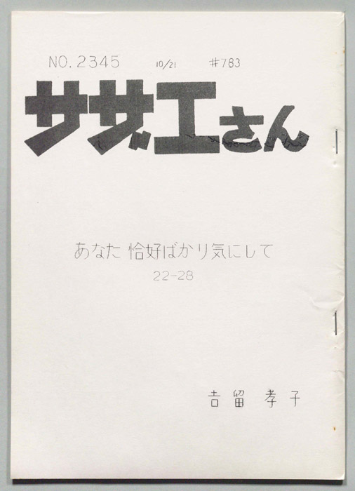 主な出演 :東京の静かな住宅地に住む「磯野家」には、父・波平、母・フネ、長女・サザエ、長男・カツオ、次女・ワカメが周囲の人々と共に、賑やかに暮らしていた。後にサザエはフグ田マスオと結婚して、長男・タラオが誕生し三世代家族として、昭