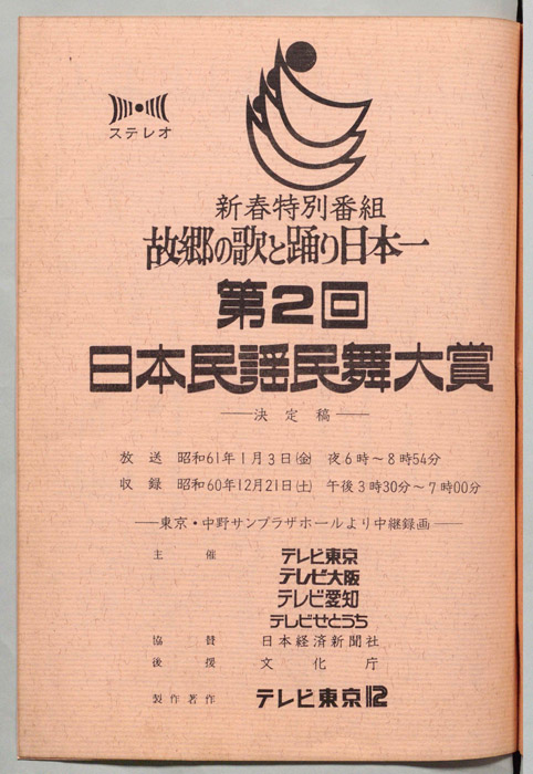 主な出演 : (司会)伊東四朗,酒井ゆきえ,(実況アナウンサー)小倉智昭,(審査員室レポーター取材)川島真理子,(表彰アシスタント)ドゥ・クリエーション,<ゲスト>(津軽三味線合奏)小山貢社中,(第一回日本民謡民舞大賞受賞団体)民謡楽成田会,(出