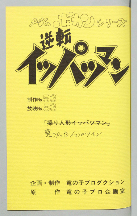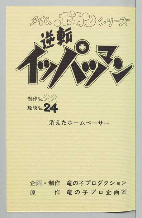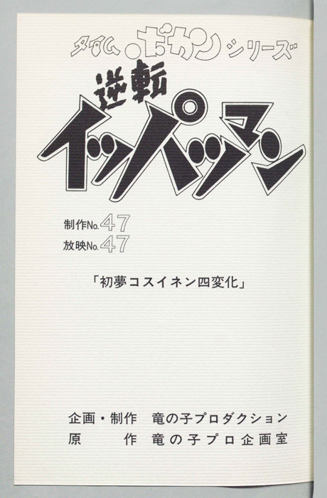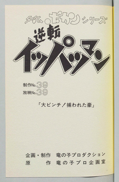 主な出演 : [豪速九(イッパツマン):富山敬,放夢ラン:原えりこ,ハル坊:つかせのりこ,2-3:山本正之,ムンムン:小原乃梨子,コストネン:八奈見乗児,キョカンチン:たてかべ和也,コン・コルドー:肝付兼太,Na:鈴置洋孝,松本営業部員,その他]『逆転イッパツマン』 国際企業番付で常に業界トップの業績を誇るタイムリース社は時空を超えて様々な時代に荷物を届けるタイム運搬事業を開始した。 そんなタイムリース社のライバル企業であるシャレコーベリース社の会長は、オ