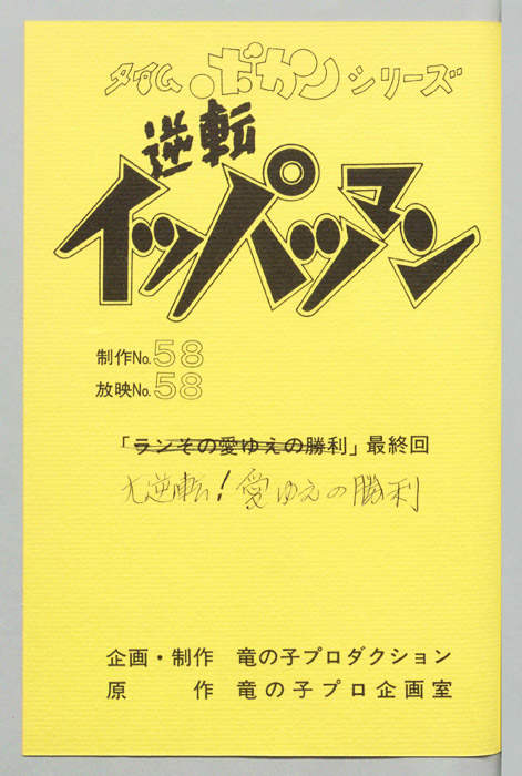 主な出演 : [豪速九(イッパツマン):富山敬,放夢ラン:原えりこ,ハル坊:つかせのりこ,2-3:山本正之,ムンムン:小原乃梨子,コストネン:八奈見乗児,キョカンチン:たてかべ和也,コン・コルドー:肝付兼太,ミンミン:土井美加,ピーコ:横尾まり,セ『逆転イッパツマン』 国際企業番付で常に業界トップの業績を誇るタイムリース社は時空を超えて様々な時代に荷物を届けるタイム運搬事業を開始した。 そんなタイムリース社のライバル企業であるシャレコーベリース社の会長は、オ