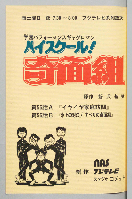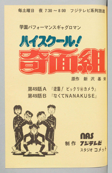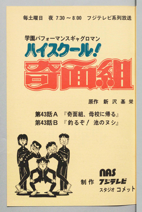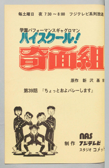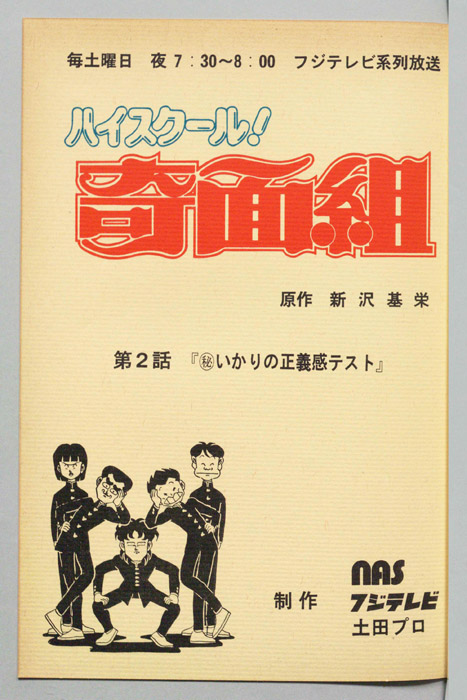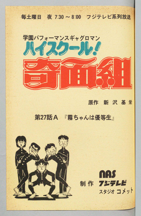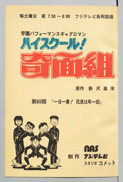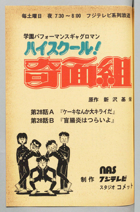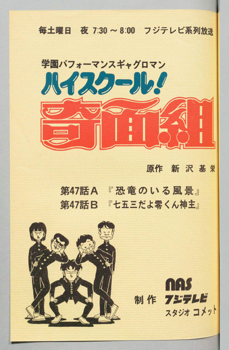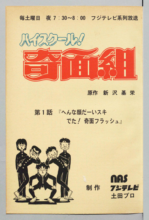主な出演 : 【奇面組】(一堂零:リーダー)千葉繫,(冷越豪)玄田哲章,(出瀬潔)二又一成,(大間仁)龍田直樹,(物星大)塩沢兼人,(河川唯)高橋美紀,(宇留千絵)松井菜桜子,(伊狩増代:3年10組担任)勝生真沙子,(海武ツヤ:家庭科教師)青『ハイスクール!奇面組』平凡な学校生活を送っていた女子中学生『河川唯(かわ ゆい)』と『宇留千絵(うる ちえ)』は、『奇面組』と呼ばれる悪名高い5人の男子学生と出会うことによって、退屈だった学生生活が一変する。奇面組のリーダー『一堂零(い