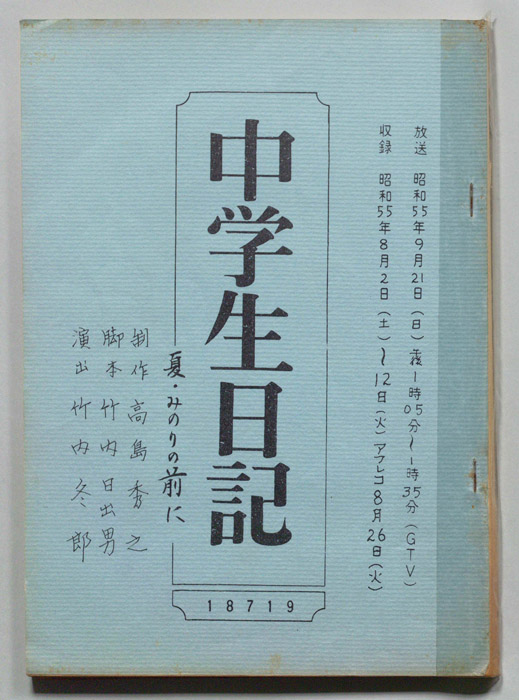 主な出演 : 堤聖月,小西邦夫【中学生日記】 中学生日記は1972年から2012年3月まで長きに渡って放送された学園ドラマである。1962年4月から放送された「中学生次郎」という番組を前身とし、何度か番組名を変更しつつ本ドラマに至る。最