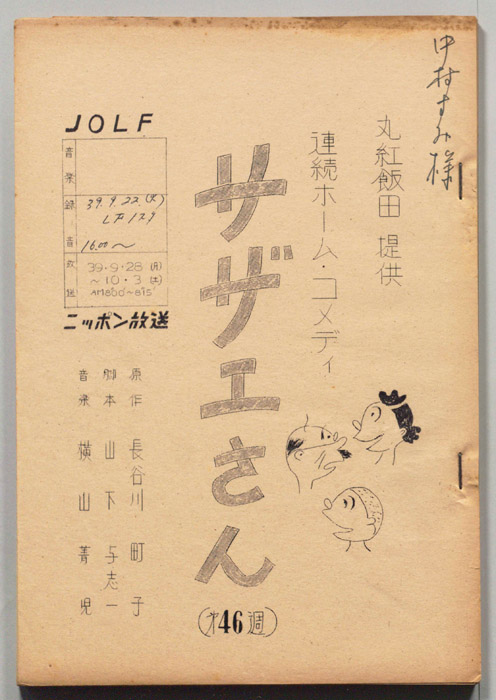 主な出演 : 横山道代,巌金四郎,露原千草,高橋実,金子由利江,谷幹一,大塚周夫,麻生美代子,大森暁美,中村すみ,植木正夫,武藤礼子東京の静かな住宅地に住む「磯野家」には、父・波平、母・フネ、長女・サザエ、長男・カツオ、次女・ワカメが周囲の人々と共に、賑やかに暮らしていた。後にサザエはフグ田マスオと結婚して、長男・タラオが誕生し三世代家族として、昭