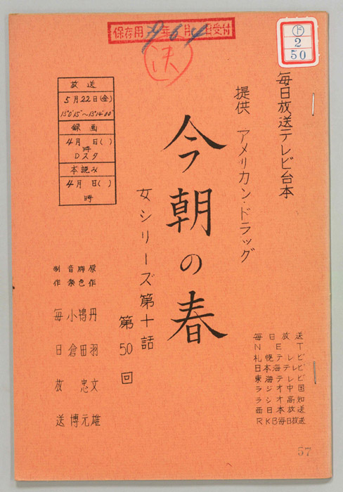 主な出演 : 口京子,水野久美,不破潤,田中直行,宮崎洋子,小林勝彦,浜砂秀男,橋本尚友,淀川昿平,山口幸生,船場汎,西山嘉孝,二宮冨士湖]- 作家 : 土井行夫,[岡本愛彦]
