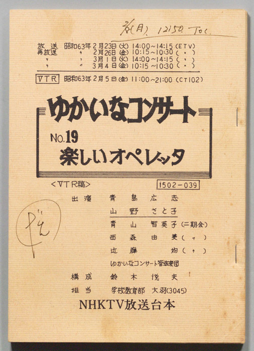 主な出演 : (司会)青島広志,山野さと子,(ゲスト)青山智英子,西森由美,近藤均,(室内楽)ゆかいなコンサート管弦楽団,(人形声)川久保潔,(人形)小林次郎,まきたまさこ