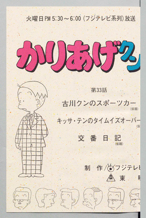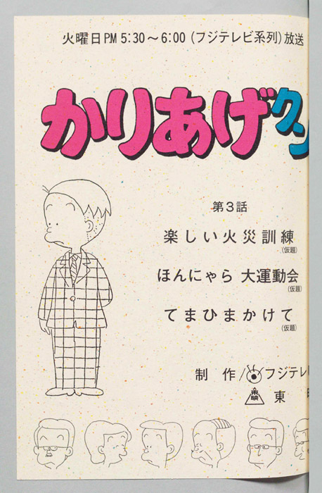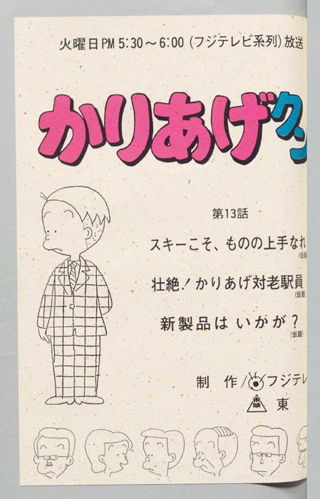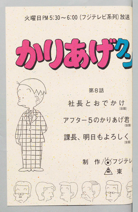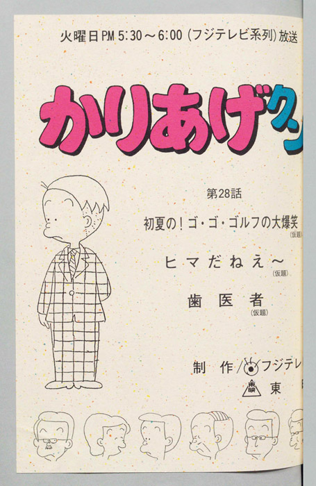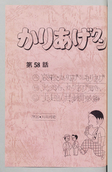 主な出演 : (A)(かりあげ)塩屋翼,(木村課長)野田圭一,(木下社長)八奈見乗児,(古川)難波圭一,(佐藤)堀川亮,(ヒサエ)渡辺菜生子,(太子)江森浩子,(隅沢),(おかみ),(仲居),(声①),(声②),(社員たち)/(B)(かりあげ)塩『かりあげクン』「ほんにゃら産業」の営業課に勤務し、刈り上げ頭が特徴的なサラリーマン「かりあげ正太」は、上司に媚びることを嫌い、人と同じ行動を取ることを好としない変わり者だった。しかし、イタズラをすることには天才的な能力を発揮する。正