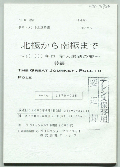 主な出演 : 田守邦,又吉究,富田めぐみ,友利由香,細山田隆人,伊藤隆大,小柳ルミ子,富司純子,沢田研二,小林旭,江守徹,萩原健一,(語り)北林谷栄,(美海(ちゅらうみ)紀行/ナレーション)平野啓子