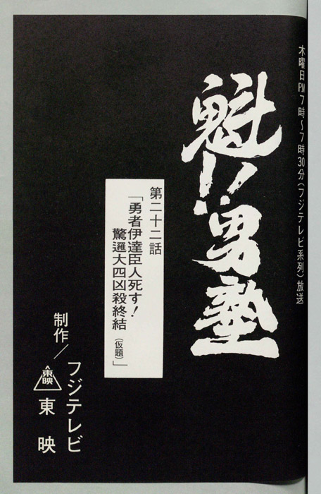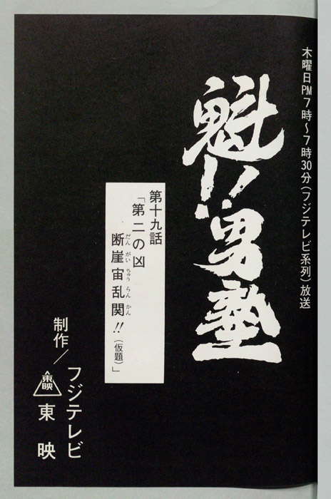 主な出演 : 之紀,(修羅和尚)清川元夢,(風海)塩屋浩三 (林海)幹本雄之,【魁!!男塾(さきがけ!! おとこじゅく)】全国のはみだし者やならず者を集め、まるで戦場を思わせるほどのスパルタ教育によって男を磨き、真の男を育成するための男塾に入学した「剣桃太郎(つるぎももたろう)」は、塾長「江田島平八(えだじま へ