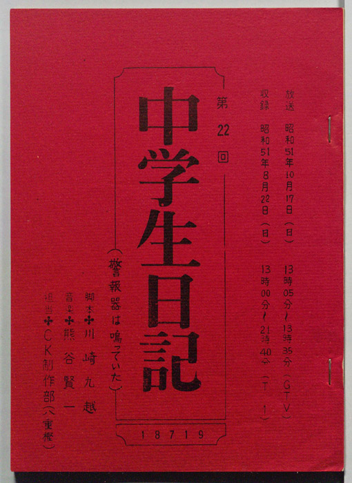 主な出演 : 本富士太,岡部雅郎,木崎裕次,藤田康雄,広瀬五朗,多田木亮佑,堀田和則,金子康雄,藤本喜久子【中学生日記】 中学生日記は1972年から2012年3月まで長きに渡って放送された学園ドラマである。1962年4月から放送された「中学生次郎」という番組を前身とし、何度か番組名を変更しつつ本ドラマに至る。最- 作家 : 松林経明