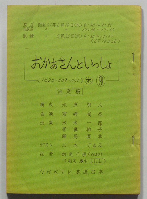 主な出演 : (司会)輪島直幸,(うた)斉藤伸子,たいらいさお,(たいそう)瀬戸口清文,(ぬいぐるみの声)大塚周夫,菅谷政子,北川智絵,(ぬいぐるみ)桜本晶弘,田原加代,千早蘭,(人形美術)川本喜八郎,岡部久義,(アニメーション)若井丈児,(エ
