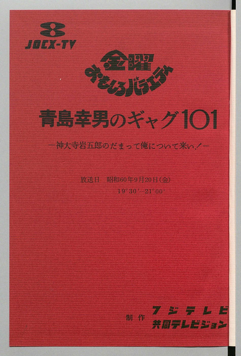 主な出演 : 青島幸男,谷啓,小松政夫,藤村俊二,研ナオコ,高見知佳,松本伊代,山田邦子,レオナルド熊,石倉三郎,高田純次,斉藤晴彦,三波豊和,コント赤信号,バブルガム・ブラザーズ,すわ親治,加納美和,劇団七旺日,スクールメイツ,音羽ゆりかご会