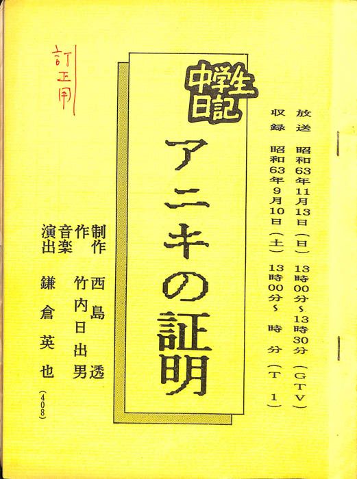 主な出演 : 馬場雅子,若杉浩平,鳥居美江【中学生日記】 中学生日記は1972年から2012年3月まで長きに渡って放送された学園ドラマである。1962年4月から放送された「中学生次郎」という番組を前身とし、何度か番組名を変更しつつ本ドラマに至る。最