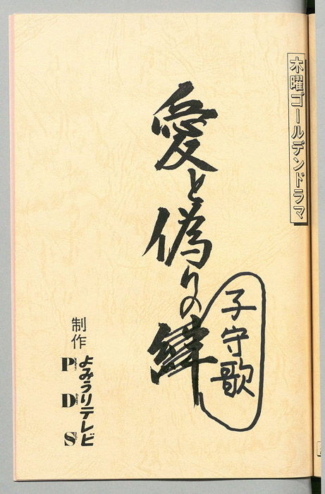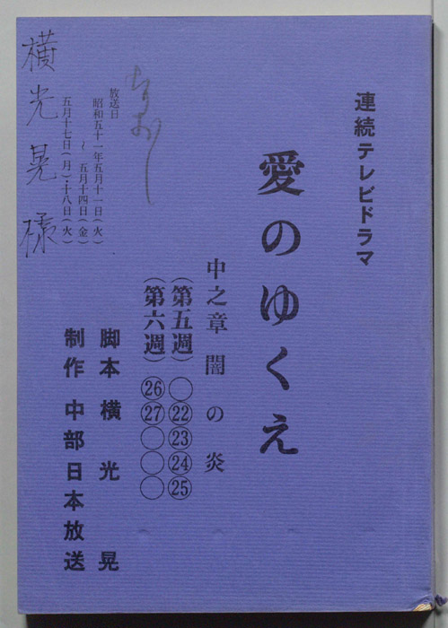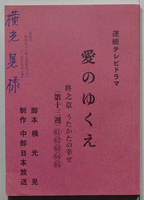 主な出演 : 乙羽信子,高峰三枝子,上原謙,池部良,[丹阿弥谷津子,井上順,音無美紀子,中田喜子,佐藤友美,村井国夫,薬丸裕英,石田ゆり子]- 作家 : 大西信行,葉村彰子