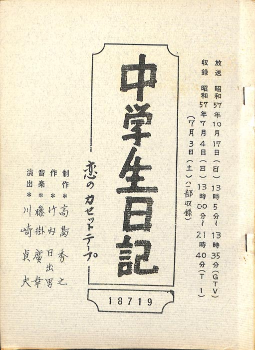 主な出演 : 東野英心,矢羽みどり,山田昌【中学生日記】 中学生日記は1972年から2012年3月まで長きに渡って放送された学園ドラマである。1962年4月から放送された「中学生次郎」という番組を前身とし、何度か番組名を変更しつつ本ドラマに至る。最