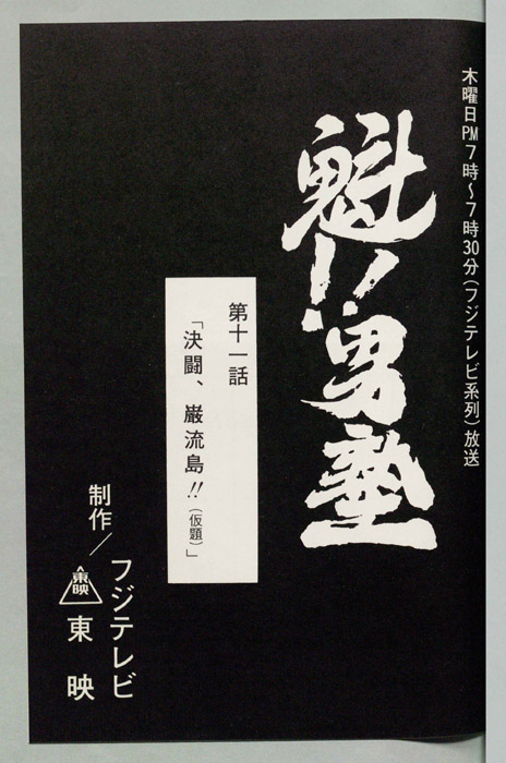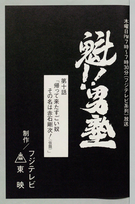 主な出演 : 田馬之助)戸谷公次,(江戸川)松尾銀三,(丸山)田中和実,(二号生A)菅谷勇,(二号生B,C),(運転手)【魁!!男塾(さきがけ!! おとこじゅく)】全国のはみだし者やならず者を集め、まるで戦場を思わせるほどのスパルタ教育によって男を磨き、真の男を育成するための男塾に入学した「剣桃太郎(つるぎももたろう)」は、塾長「江田島平八(えだじま へ