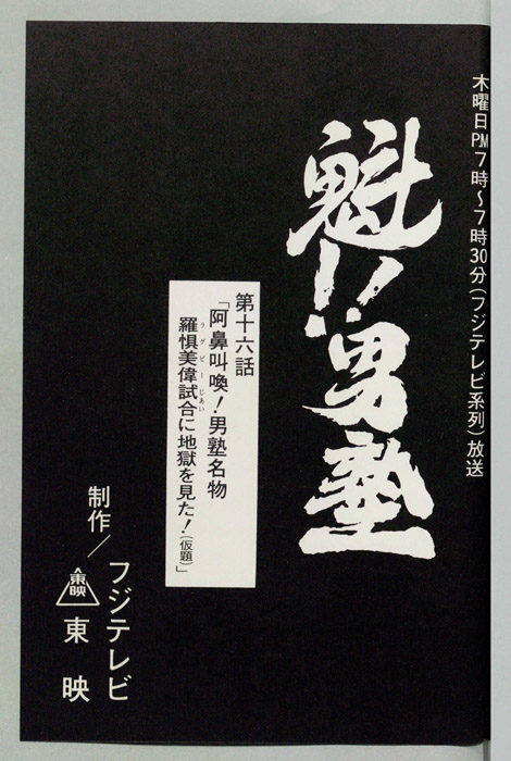 主な出演 : 田馬之助)戸谷公次,(江戸川)松尾銀三,(丸山)田中和実,(二号生A)堀之紀,(二号生B)沢木郁也,(赤石剛次)森功至,(お手伝いさん),(ヤクザA)佐藤正治,(ヤクザB)掛川裕彦,(スピーカーの声),(サラリーマンA),(サラリーマンB),(女【魁!!男塾(さきがけ!! おとこじゅく)】全国のはみだし者やならず者を集め、まるで戦場を思わせるほどのスパルタ教育によって男を磨き、真の男を育成するための男塾に入学した「剣桃太郎(つるぎももたろう)」は、塾長「江田島平八(えだじま へ