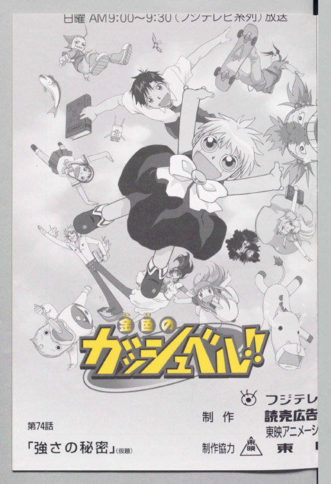 主な出演 : (ガッシュ・ベル)大谷育江,(高嶺清麿)桜井孝宏,(ウマゴン)こおろぎさとみ,(サンビーム)郷田ほづみ,(ティオ)釘宮理恵,(恵)前田愛,(キャンチョメ)菊池正美,(フォルゴレ)高橋広樹,(ナゾナゾ博士)納谷六朗,(パムーン)松岡洋子【金色のガッシュベル】 千年に一度行われる『魔界の王』を決める戦いに選ばれた百人の魔物の子供達、彼らは自身の内に秘めた力を引き出せる同じ心の形を持った人間のパートナーを探して、人間界で『魔本』の
