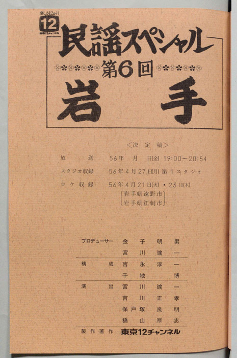 主な出演 : 本秀茂,(鳴物)山田鶴助,山田鶴志,(唄囃子)志村春美,秋野恵子,(尺八)米谷威和男,(岩手ロケ)高橋キヨ子,金津流獅子躍,原体剣舞連,(司会)林家木久蔵,(金津流獅子躍・庭元)平野幸男,「南部牛方節」(唄)熊谷岩月,(尺八)斎藤光雄,「外山節」(唄